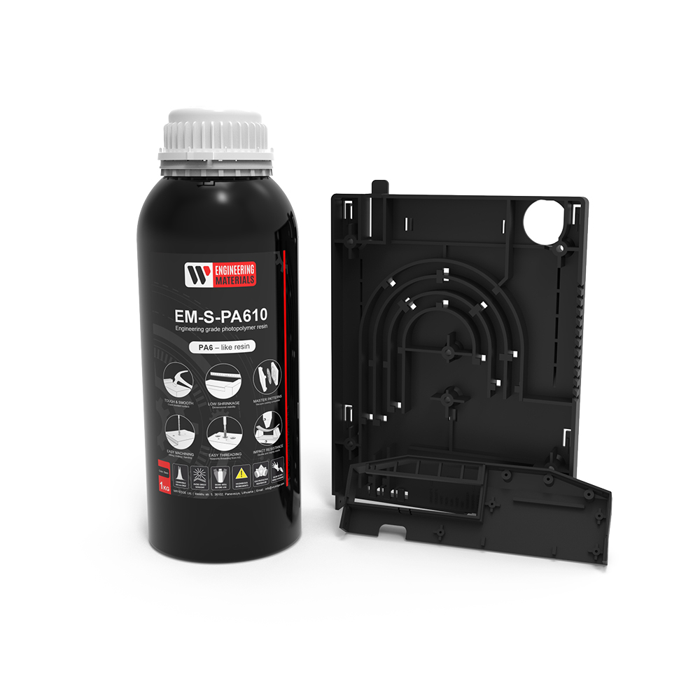 Ši derva išlaiko savo formos stabilumą iki ~75 °C temperatūros (HDT pagal ASTM D648), todėl gali būti naudojama net ir kiek padidintos temperatūros sąlygomis – pavyzdžiui, elektronikos komponentų laikikliuose ar uždarose ertmėse, kur kaupiasi šiluma. Naudojant EM-S-PA610, rekomenduojama sluoksnio storis – apie 0.05 mm, ekspozicijos laikas ~2.5 s, o pagrindo sluoksniams – iki 20 s. Po spausdinimo detalės plaunamos izopropilo alkoholyje (IPA) ir sukietinamos UV lempoje (10–30 min, priklausomai nuo detalių storio).
