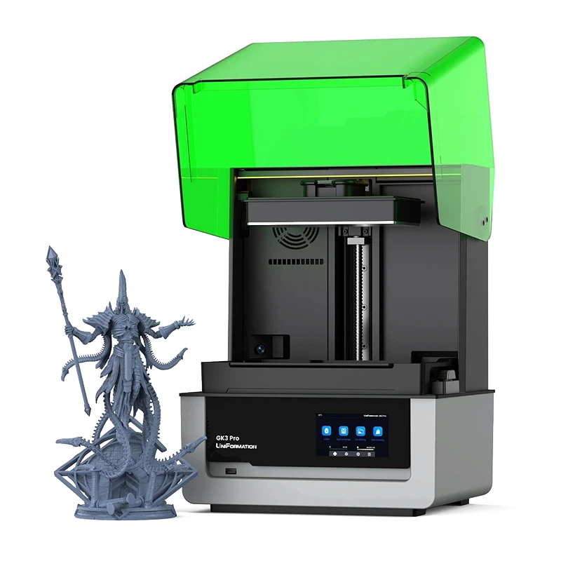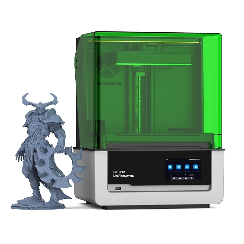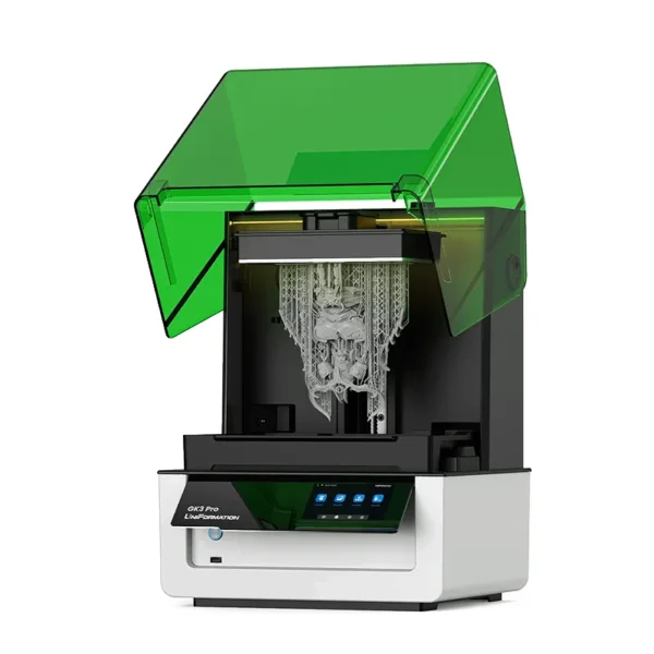 UniFormation GK3 Pro – pažangiausias GK3 serijos 3D spausdintuvas, skirtas profesionalams, kuriems reikalingas didžiausias tikslumas ir patikimumas. Šis modelis išsiskiria unikaliu 385 nm UV šviesos šaltiniu su COB ir Fresnel kolimavimo lęšiais, kurie užtikrina itin švarų ir tikslų kietinimą. Ši technologija ypač naudinga spausdinant su skaidriomis dervomis, nes padeda išvengti perteklinio kietėjimo ir leidžia išgauti aukščiausios kokybės paviršius bei detalių skaidrumą. 9,6″ aukšto pralaidumo 16K ekranas (15120 × 6230 raiška, XY 14 × 19 µm) užtikrina mikroninį tikslumą, leidžiantį atkurti net smulkiausias detales.