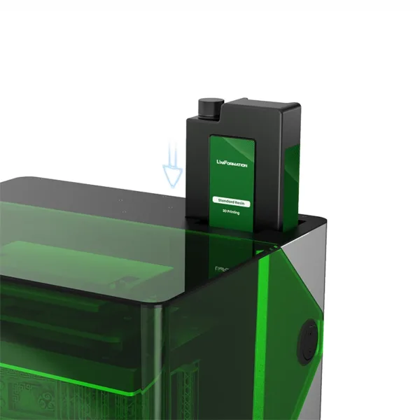 - Automatinė dervos padavimo sistema – aptinka lygį rezervuare ir kasetėje, užtikrina nuolatinį papildymą be rankinio darbo.