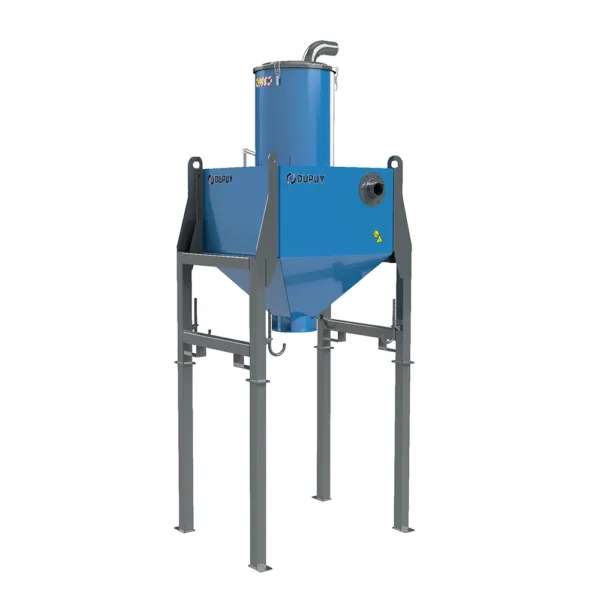 DU-PUY SILOFILTER 600–1000 yra aukštos klasės pramoninis filtravimo modulis, sukurtas efektyviam dulkių atskyrimui ir surinkimui sprogioje aplinkoje (sertifikuota pagal EN IEC 62784:2018 Zone 22). Įrenginys veikia kaip centrinės vakuumo sistemos filtravimo mazgas su galimybe surinkti iki 600 arba net 1000 litrų dulkių bei birių medžiagų į plieninį konteinerį. Dulkių pašalinimas vykdomas naudojant rankinį drugelinį vožtuvą, kuris leidžia greitai iškrauti turinį į big-bag maišus ar kitą surinkimo tarą. Sistemą sudaro antistatinis poliesterinis filtravimo elementas, kuris įrengtas kišenių tipo filtrų modulyje. Filtravimo paviršiaus plotas siekia net 50 000 cm² (560 mm skersmens), todėl užtikrinamas ilgalaikis veikimas be dažnos priežiūros. Filtras yra itin atsparus dulkėms ir pasižymi geru oro pralaidumu bei minimaliu užsikimšimo lygiu.