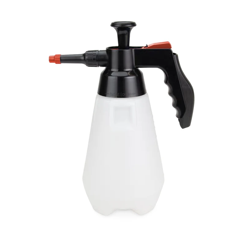 Profesionalus suslėgto oro purkštuvas, kurio talpa pagaminta iš HDPE plastiko su aiškia užpildymo skale, ergonomiška PA6 plastiko rankena, reguliuojamu purškimo antgaliu ir mygtuku nuolatiniam purškimui.