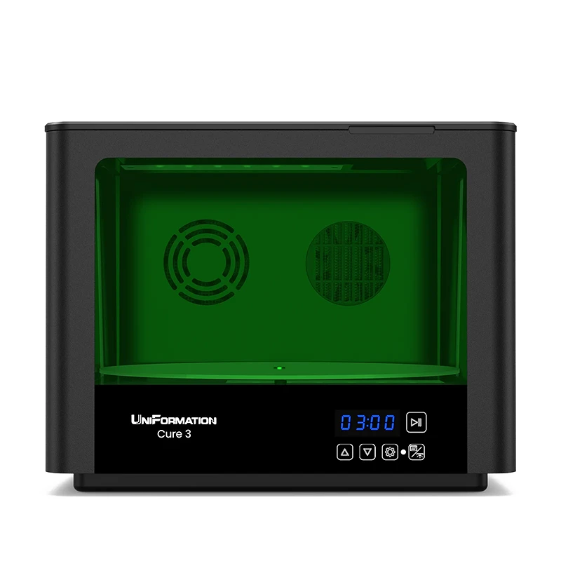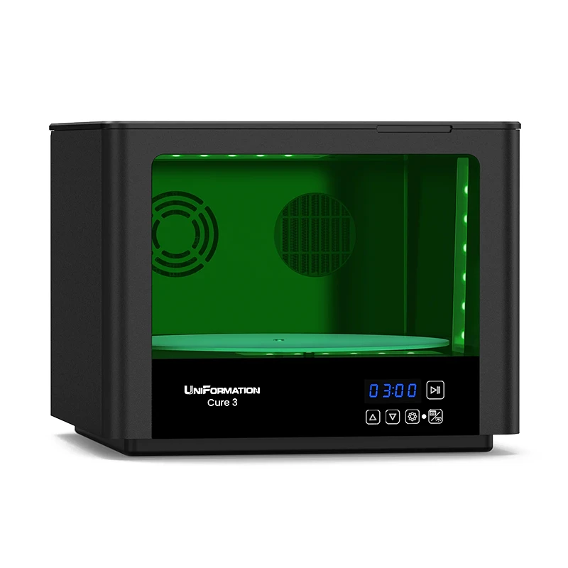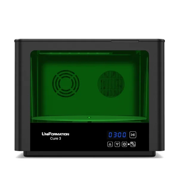 UniFormation Cure3 – tai profesionali UV kietinimo stotelė, pritaikyta intensyviam naudojimui. Įrenginys turi 282 × 162 mm darbinę erdvę, leidžiančią vienu metu apdoroti tiek pavienius objektus, tiek kelis mažesnius spausdinius. Kamera pasižymi džiovinimo ir kietinimo 2-in-1 funkcija: integruotas šildymo elementas leidžia greitai išdžiovinti spausdinius iki 45 °C temperatūroje, o 24 UV lempos, išdėstytos iš visų pusių, kartu su 360° pasukamu stalu užtikrina tolygų šviesos pasiskirstymą ir kokybišką kietinimą.